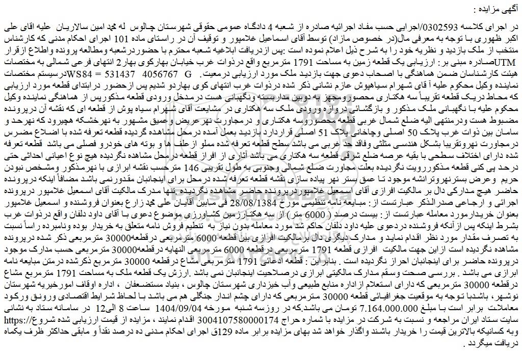 در اجرای کلاسه 0302593/اجرایی حسب مفاد اجرائیه صادره از شعبه 4 دادگاه عمومی حقوقی شهرستان چالوس له محمد امین سالاریان علیه اقای علی اکبر ظهوری با توجه به معرفی مال(در خصوص مازاد) توسط آقای اسماعیل غلامپور و توقیف آن در راستای ماده 101 اجرای احکام مدنی که کارشناس منتخب از ملک بازدید و نظریه خود را به شرح ذیل اعلام نموده است :پس ازدریافت ابلاغیه شعبه محترم با حضوردرشعبه ومطالعه پرونده واطلاع ازقرار صادره مبنی بر: ارزیابی یک قطعه زمین به مساحت 1791 مترمربع واقع درذوات غرب خیابان بهارکوی بهار2 انتهای فرعی شمالی به مختصاتutm درسیستم مختصاتws84 = 531437 4056767 g . هیئت کارشناسان ضمن هماهنگی با اصحاب دعوی جهت بازدید ملک مورد ارزیابی درمعیت نماینده وکیل محکوم علیه آ قای شهرام سیاهپوش عازم نشانی ذکر شده درذوات غرب انتهای کوی بهاردو شدیم پس ازحضور درابتدای قطعه مورد ارزیابی که محاط دریک قطعه تقریباً سه هکتاری محصورومجهز به دوبین مداربسته ونگهبانی هست درمدخل ورودی قطعه مذکورپس از هماهنگی نماینده وکیل محکوم علیه با نگهبانی ملک مذکور و بازگشائی دروازه ورودی ملک سه هکتاری در مشایعت آقای شهرام سیاه پوش از قطعه ای که نقشه آن درپرونده مضبوط هست ودرمنتهی الیه ضلع شمال غربی قطعه محصوروسه هکتاری و درمجاورت نهرعریض وعمیق مشهور به نهرخشکه هچیرود که نهرحد و سامان بین ذوات غرب پلاک 50 اصلی وچاخانی پلاک 51 اصلی قراردارد بازدید بعمل آمده درمحل مشاهده گردیده قطعه تعرفه شده با اضلاع مضرس درمجاورت نهروتقریبا بشکل هندسی مثلثی وفاقد حد غربی می باشد سطح قطعه تعرفه شده مملو ازعلف ها و بوته های خودرو فصلی می باشد قطعه تعرفه شده دارای اختلاف سطحی با بقیه عرصه ضلع شرقی قطعه سه هکتاری می باشد آثاری از افراز قطعه درمحل مشاهده نگردیده هیچ نوع اعیانی احداثی حتی درحد پی کنی قطعه مذکوررویت نگردیده بعلت مجاورت ضلع شمالی وجنوبی به طول تقریبی 146 مترحسب نقشه ابرازی با نهرمذکور ومشخص نبودن حریم وعرض بسترنهروترانشه موجود تا عمق بستر نهر پیاده سازی نقشه قطعه تعرفه شده درمحل برای اینجانبان مقدورنمی باشد مضافاً اینکه درپرونده حاضر هیچ مدارکی دال بر مالکیت افرازی آقای اسمعیل غلامپوردرپرونده حاضر مشاهده نگردیده .تنها مدرک مالکیت آقای اسمعیل غلامپور درپرونده اجرائی و ارجاعی صدرالذکر عبارتست از: مبایعه نامه تنظیمی مورخ 28/08/1384 فی مابین آقایان علی محمد زارع بعنوان فروشنده و اسمعیل غلامپور بعنوان خریدارمورد معامله عبارتست از: بیست درصد ( 6000 متر) از سه هکتارزمین کشاورزی موضوع دعوی با آقای داود دلفان واقع درذوات غرب بشرط اینکه پس ازآنکه فروشنده دردعوی علیه داود دلفان حاکم شد مورد معامله بدون نیاز به تنطیم فروش نامه متعلق به خریدار بوده ونامبرده راساً نسبت به تصرف مقدار مورد نظر اقدام نماید و مدارک دیگری دال برمالکیت افرازی بین قطعه 6000 مترمربعی درقطعه30000 مترمربعی ذکر شده درپرونده مشاهده نگردیده است ازاین جهت مالکیت افرازی قطعه 1791 مترمربعی درقطعه 6000 مترمربعی النهایه درقطعه30000 مترمربعی حسب مدارک موجود درپرونده حاضر برای اینجانبان احراز نگردیده است . بنابراین : قطعه ادعائی 1791 مترمربعی مشاع درقطعه 30000 مترمربع ذکرشده درمتن مبایعه نامه ابرازی می باشد . بررسی صحت وسقم مدارک مالکیتی ابرازی درصلاحیت اینجانبان نمی باشد .ارزش یک قطعه ملک به مساحت 1791 مترمربع مشاع درقطعه 30000 مترمربعی که دارای استعلام ازاداره منابع طبیعی وآب خیزداری شهرستان چالوس ، بنیاد مستضعفان ، اداره اوقاف امورخیریه شهرستان نوشهر، باشدبا توجه به موقعیت جغرافیائی قطعه 30000 مترمربعی که دارای چشم اندار جنگلی هم می باشد با لحاظ شرایط اقتصادی ورونق ورکود معاملات برابر است با مبلغ 7.164.000.000 تومان می باشد.که در روزسه شنبه مورخه 1404/09/04 ساعت 8 الی12 در سامانه ستاد به نشانی سایت ستاد ایران مراجعه و نسبت به شرکت در مزایده با شماره حراج 3004107580000174 اقدام نمایند ، مزایده از قیمت ارزیابی شده ش
