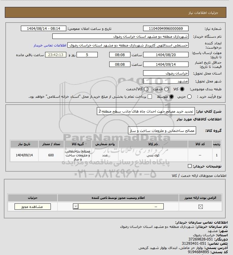 شرح کلی نیاز: تجدید خرید مصالح جهت احداث چاه های جاذب سطح منطقه 2