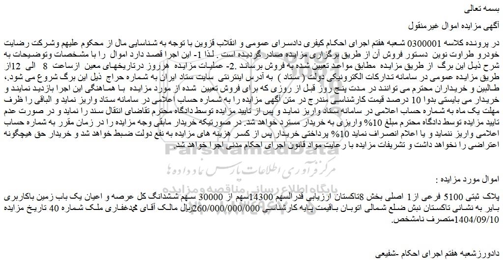 مزایده 14300سهم از 30000 سهم ششدانگ کل عرصه و اعیان یک باب زمین باکاربری ؟