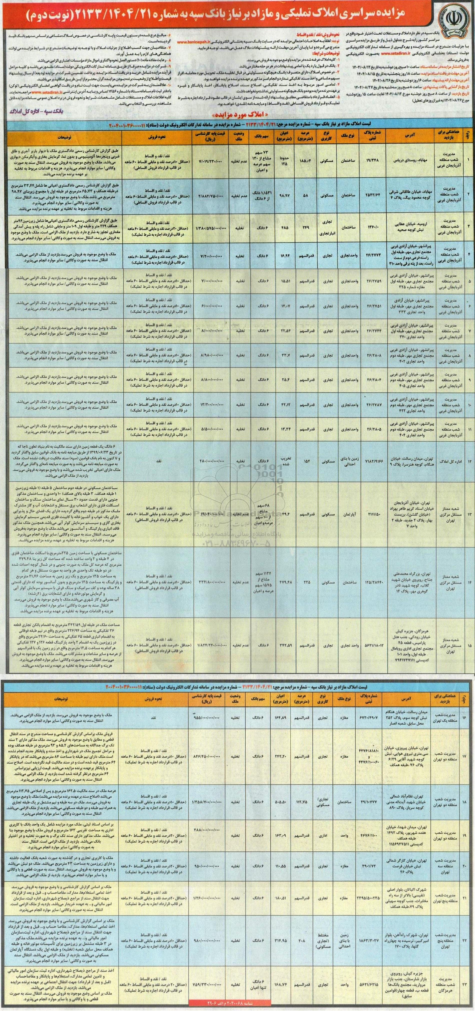 مزایده سراسری املاک تملیکی و مازاد بر نیاز بانک سپه به شماره 2133/1404/21 - نوبت دوم ؟