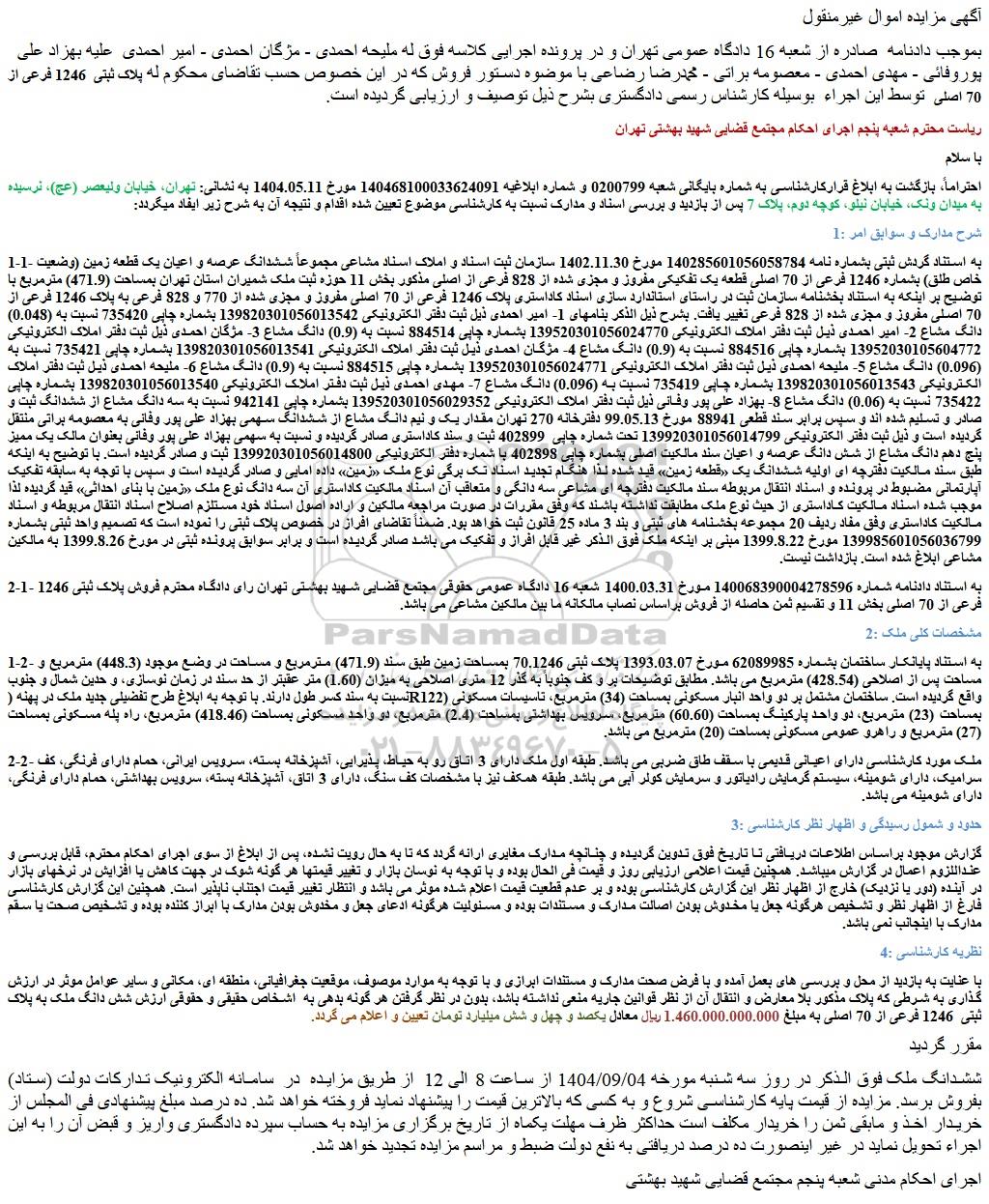 مزایده ششدانگ عرصه و اعیان یک قطعه زمین (وضعیت خاص طلق) بشماره 1246 فرعی از 70 اصلی قطعه یک تفکیکی مفروز و مجزی شده از 828 فرعی از اصلی ؟