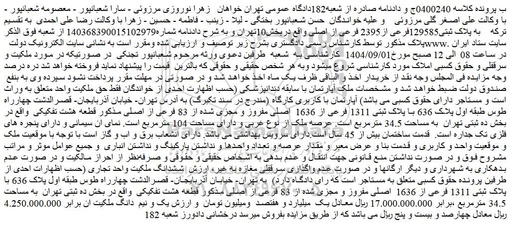 ب پرونده کلاسه 0400240ج و دادنامه صادره از شعبه182دادگاه عمومی تهران خواهان زهرا نوروزی مرزوئی - سارا شعبانپور - معصومه شعبانپور - با وکالت علی اصغر گلی مرزوئی و علیه خواندگان حسن شعبانپور بختگی - لیلا - زینب - فاطمه - حسین - زهرا با وکالت رضا علی احمدی به تقسیم ترکه به پلاک ثبتی129585فرعی از2395 فرعی از اصلی واقع دربخش10تهران و به شرح دادنامه شماره140368390015102979 از شعبه فوق الذکر پلاک مذکور توسط کارشناس رسمی دادگستری بشرح زیر توصیف و ارزیابی شده ومقرر است به نشانی سایت الکترونیک دولت سایت ستاد ایران در ساعت 08 الی 12 صبح مورخ1404/09/01 کارشناسی به شعبه طرفین دعوی ورثه مرحوم شعبانپور تجنکی در صورتیکه در مورد ملکیت و سرقفلی و حقوق کسبی املاک مورد کارشناسی شروع میشود وبه هر شخص حقیقی و حقوقی که بالترین قیمت را پیشنهاد نماید فروخته خواهد شد دره درصد وجه مزایده فی المجلس وجه نقد از خریدار اخذ و الباقی ظرف یک ماه اخذ خواهد شد و در صورتی در مهلت مقرر پرداخت نشود سپرده وی به بنفع صندوق دولت ضبط خواهد شد و مشخصات ملک آپارتمان با سابقه دندانپزشکی (حسب اظهارت احدی از خواندگان فقط حق ملکیت واحد متعلق به وراث است و مستاجر دارای حقوق کسبی می باشد) آپارتمان با کاربری کارگاه (مندرج در سند تکبرگ) به آدرس تهران- خیابان آذربایجان- قصرالدشت چهارراه طوس طبقه اول پلاک 636 با پلاک ثبتی 1311 فرعی از 1636 اصلی مفروز و مجزی شده از 83 فرعی از اصلی مذکور قطعه هشت تفکیکی واقع در بخش ده ثبتی تهران به مساحت 34.5 مترمربع است. عرصه ملک از نوع غربی و دارای مساحت 104 مترمربع است. نمای ان سیمانی و دارای پنجره های فلزی تک جداره است. قدمت ساختمان بیش از 45 سال است.دارای سرویس بهداشتی می باشد. دارای انشعاب برق و اب و گاز است با توجه با موقعیت ملک و موقعیت واحد و کاربری و قدمت بنا و عرض معبر و مقدار عرصه و تعداد واحدها و نداشتن پارکینگ و نداشتن انباری و جمیع عوامل موثر و مراتب مشروح فوق و در صورت نداشتن منع قانونی جهت انتقال و عدم بدهی به اشخاص حقیقی و حقوقی و صرفه نظر از احراز مالکیت و در صورت عدم بدهکاری به شهرداری و دیگر ارگانها و در صورت عدم واگذاری سرقفلی مغازه به غیر، ارزش ششدانگ ملکیت واحد تجاری (حسب اظهارات احدی از طرفین پرونده حقوق کسبی متعلق به مستاجر است که رای دادگاه دارد) به تهران- خیابان آذربایجان- قصرالدشت چهارراه طوس طبقه اول پلاک 636 با پلاک ثبتی 1311 فرعی از 1636 اصلی مفروز و مجزی شده از 83 فرعی از اصلی مذکور قطعه هشت تفکیکی واقع در بخش ده ثبتی تهران به مساحت 34.5 مترمربع ،برابر 17.000.000.000 ریال معادل یک میلیارد و هفتصد ومیلیون تومان و ارزش یک و نیم دانگ ملکیت ان برابر 4.250.000.000 ریال معادل چهارصد و بیست و پنج ریال می باشد که از طریق مزایده بفروش میرسد درخشانی دادورز شعبه 182