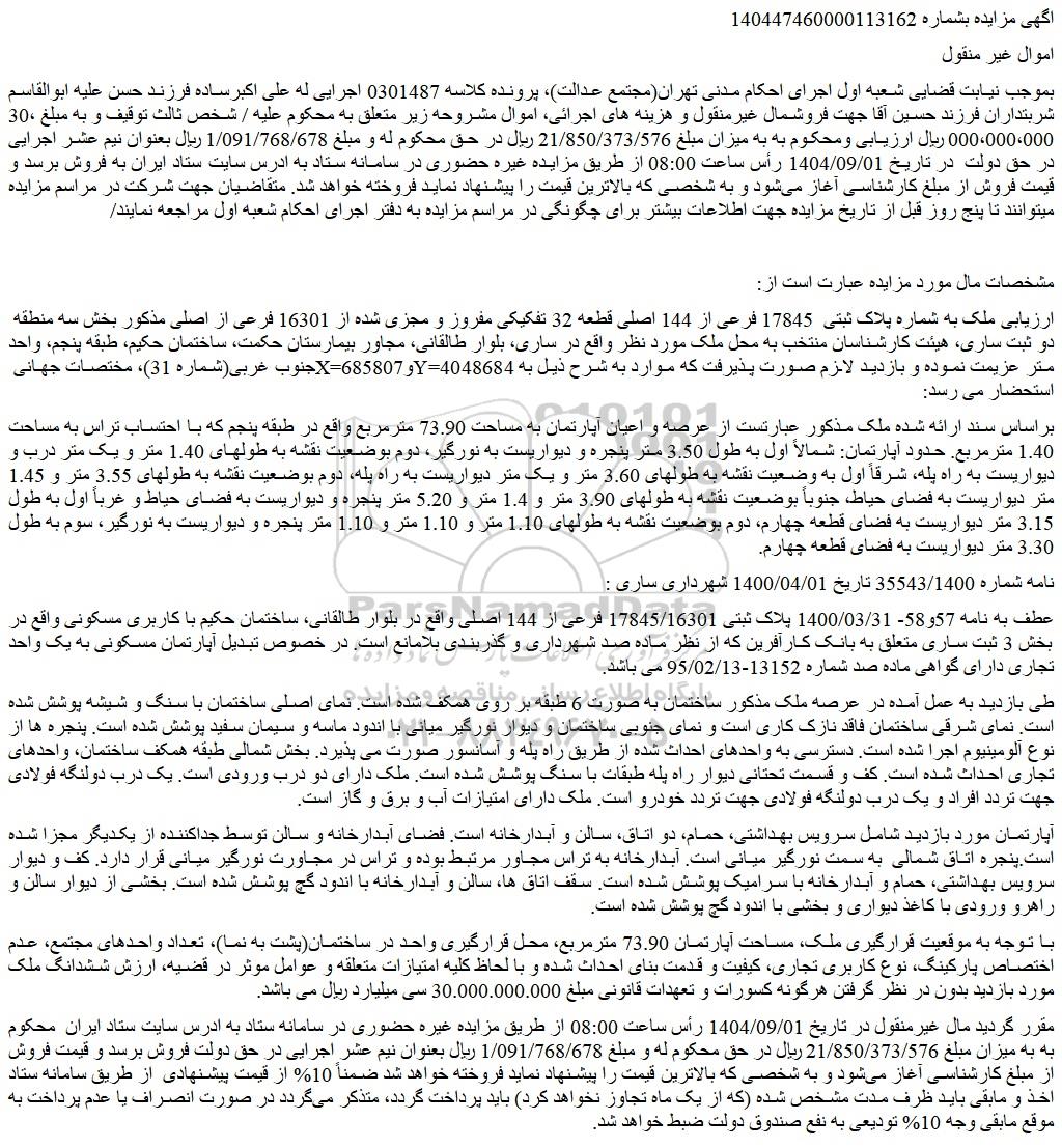 مزایده ملک به شماره پلاک ثبتی 17845 فرعی از 144 اصلی قطعه 32 تفکیکی مفروز و مجزی شده از 16301 فرعی از اصلی ؟