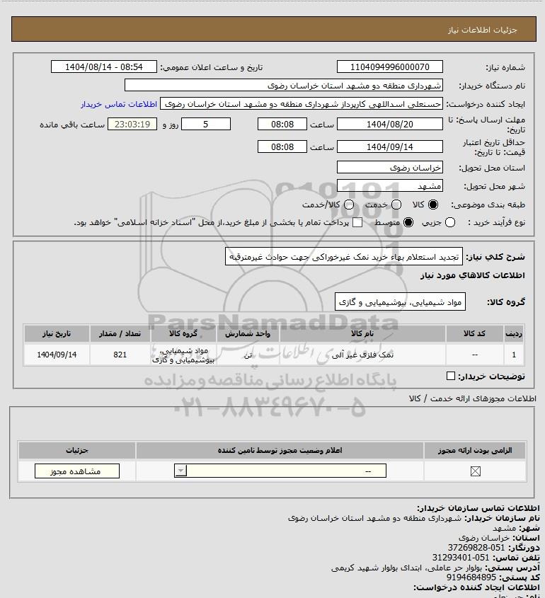 استعلام تجدید استعلام بهاء خرید نمک غیرخوراکی جهت حوادث غیرمترقبه, استعلام تجدید استعلام بهاء خرید نمک غیرخوراکی جهت حوادث غیرمترقبه