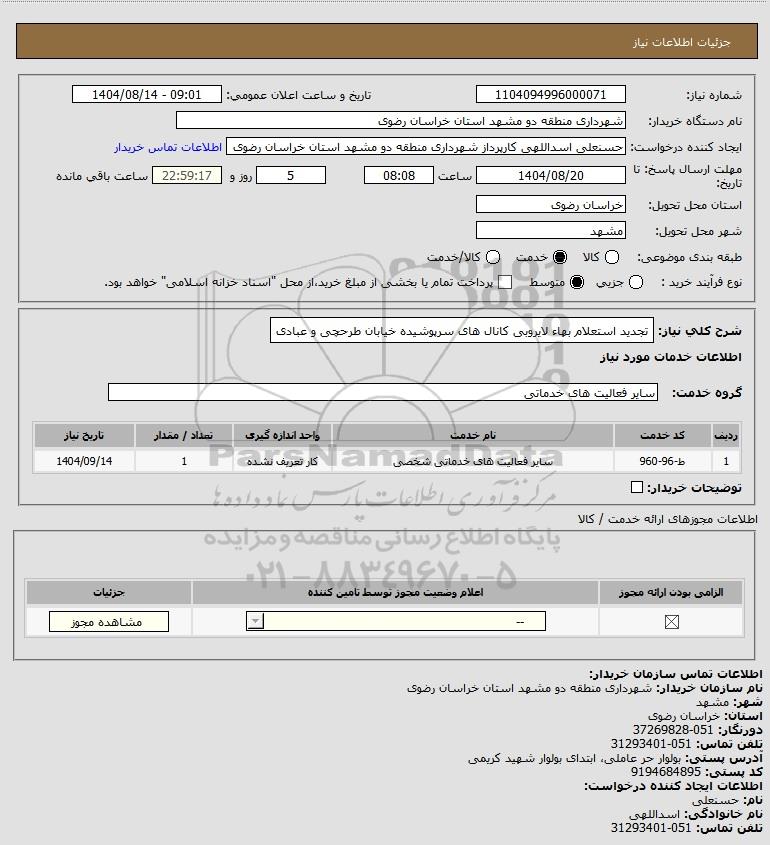 استعلام تجدید استعلام بهاء لایروبی کانال های سرپوشیده خیابان طرحچی و عبادی, استعلام تجدید استعلام بهاء لایروبی کانال های سرپوشیده خیابان طرحچی و عبادی