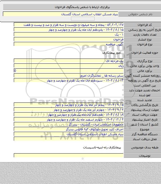 علاقهمندان میتوانند جهت دریافت اسناد و اطلاعات تکمیلی، مناقصه اجرای کلید تحویل بلوکهای ۲و۶ فانوس بندرگز با سامانه مناقصات و مزایدات ایران پارسنماد داده ها 88349670 تماس حاصل نمایند.