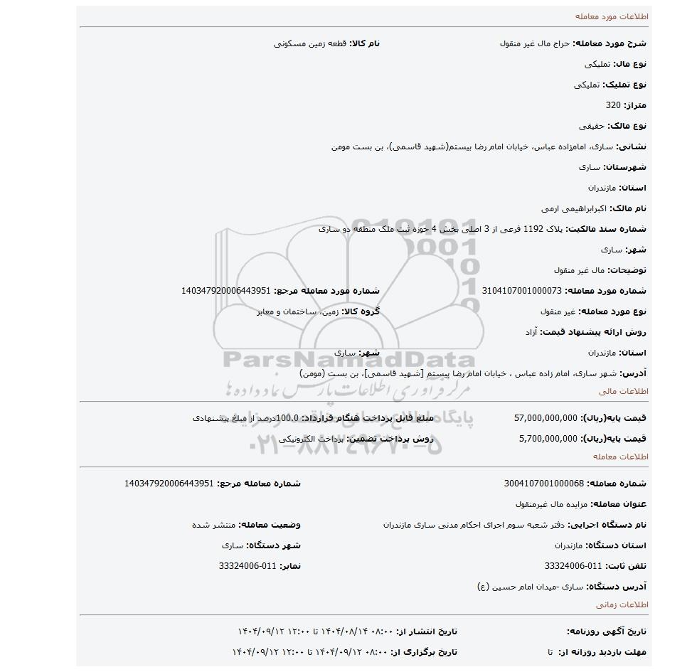 شماره سند مالکیت: پلاک 1192 فرعی از 3 اصلی بخش 4 حوزه ثبت ملک منطقه دو ساری