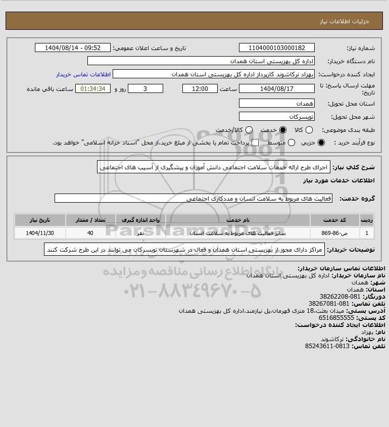 شرح کلی نیاز: اجرای طرح ارائه خدمات سلامت اجتماعی دانش آموزان و پیشگیری از آسیب های اجتماعی