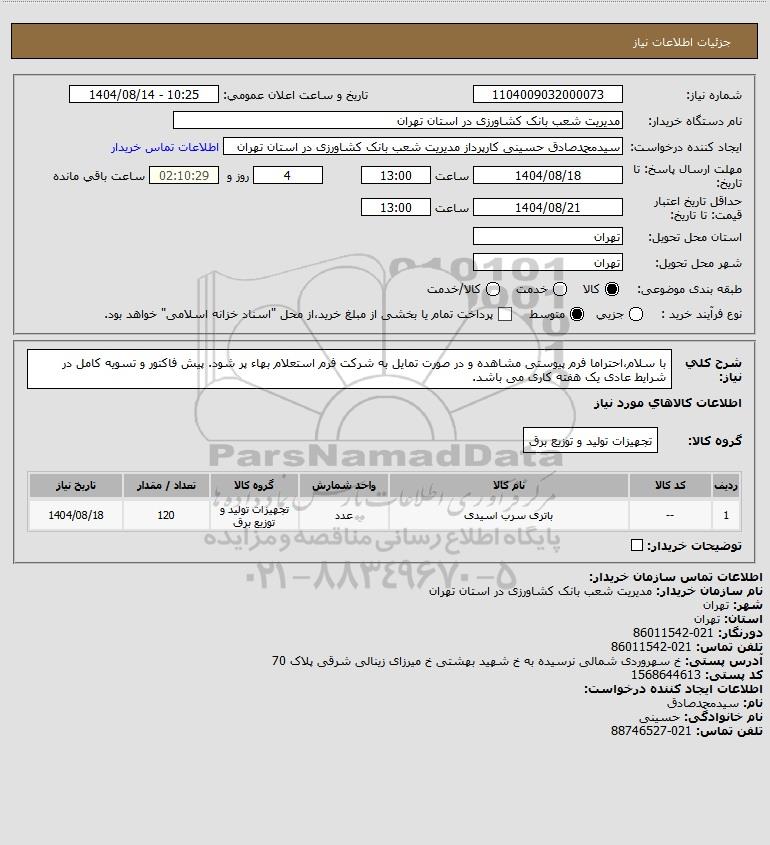| 1 | -- | باتری سرب اسیدی | عدد | تجهیزات تولید و توزیع برق | 120 | 1404/08/18 |
