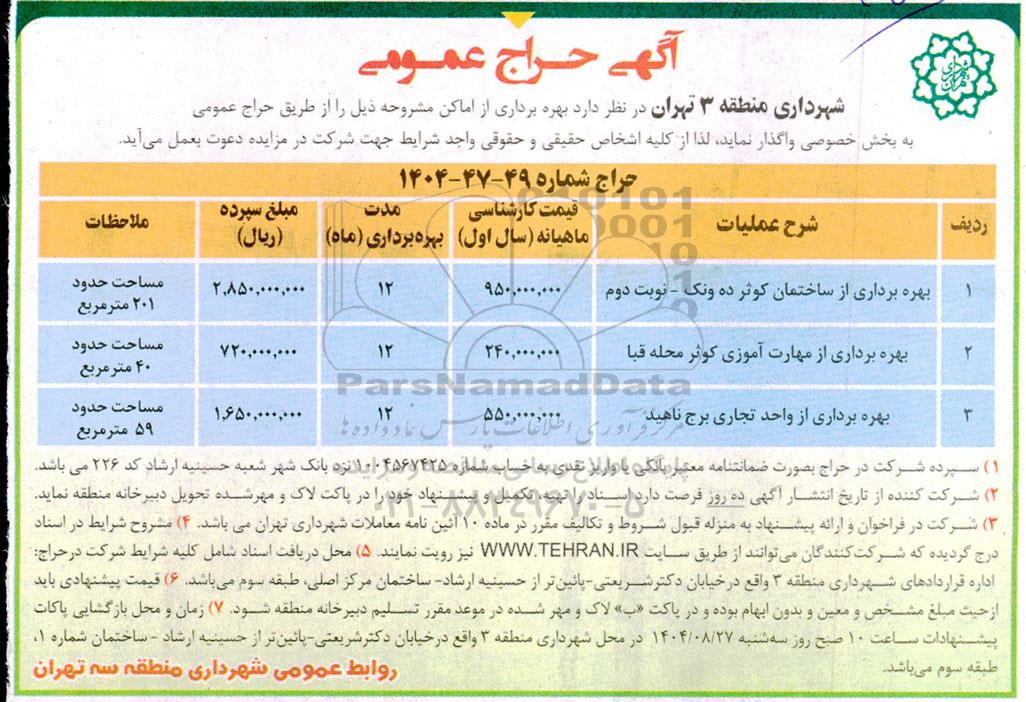شهرداری منطقه 3 تهران در نظر دارد بهره برداری از اماکن مشروحه ذیل را از طریق حراج عمومی به بخش خصوصی واگذار نماید. لذا از کلیه اشخاص حقیقی و حقوقی واجد شرایط جهت شرکت در مزایده دعوت بعمل می آید.