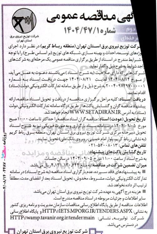 شرکت توزیع نیروی برق استان تهران (منطقه رباط کریم) در نظر دارد اجرای پروژه های توسعه، احداث و بهینه سازی شبکه های توزیع (بر اساس طرح) را با توجه به شرایط مندرج در اسناد از طریق برگزاری مناقصه عمومی یک مرحله ای به شرکت های واجد شرایط به شرح ذیل واگذار نماید.