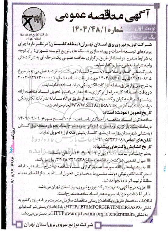 شرکت توزیع نیروی برق استان تهران (منطقه گلستان) در نظر دارد اجرای پروژه های توسعه احداث و بهینه سازی شبکه های توزیع توسعه شهری را با توجه به شرایط مندرج در اسناد از طریق برگزاری مناقصه عمومی یک مرحله ای به شرکتهای واجد شرایط به شرح ذیل واگذار نماید.
