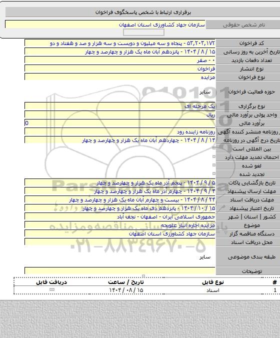 مزایده عمومی مزایده مزایده اجاره انبار علویجه برگزار میگردد. از کلیه افراد متخصص و شرکتهای واجد شرایط دعوت به عمل میآید تا در این مزایده با کد خبرگزاری پارس نماد : 9806471 شرکت نمایند تاریخ شروع مزایده : 1404/08/14 مهلت شرکت در مزایده: تا پایان روز 1404/08/24 مکان برگزاری اموال واگذاری استانهای مزایدات استان اصفهان و دستهبندیهای مربوط به این حراجی ماشین آلات و تجهیزات کشاورزی و دام پروری, واگذاری ورزشگاه، پارکینگ، غرفه و بوفه میباشد.