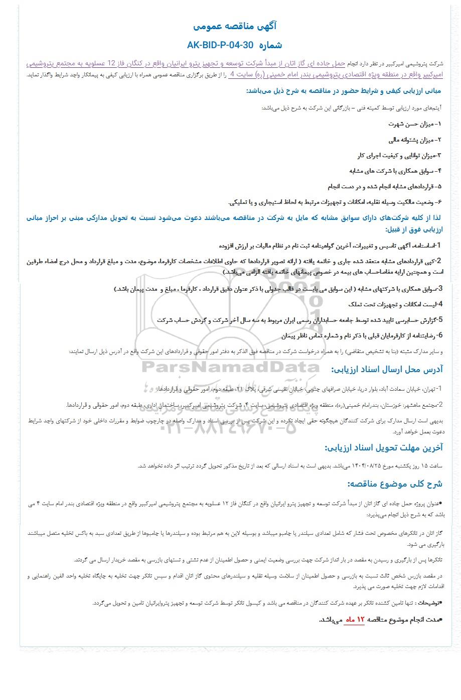 شرکت پتروشیمی امیرکبیر در نظر دارد انجام حمل جاده ای گاز اتان از مبدأ شرکت توسعه و تجهیز پترو ایرانیان واقع در کنگان فاز 12 عسلویه به مجتمع پتروشیمی امیرکبیر واقع در منطقه ویژه اقتصادی پتروشیمی بندر امام خمینی (ره) سایت 4 را از طریق برگزاری مناقصه عمومی همراه با ارزیابی کیفی به پیمانکار واجد شرایط واگذار نماید.