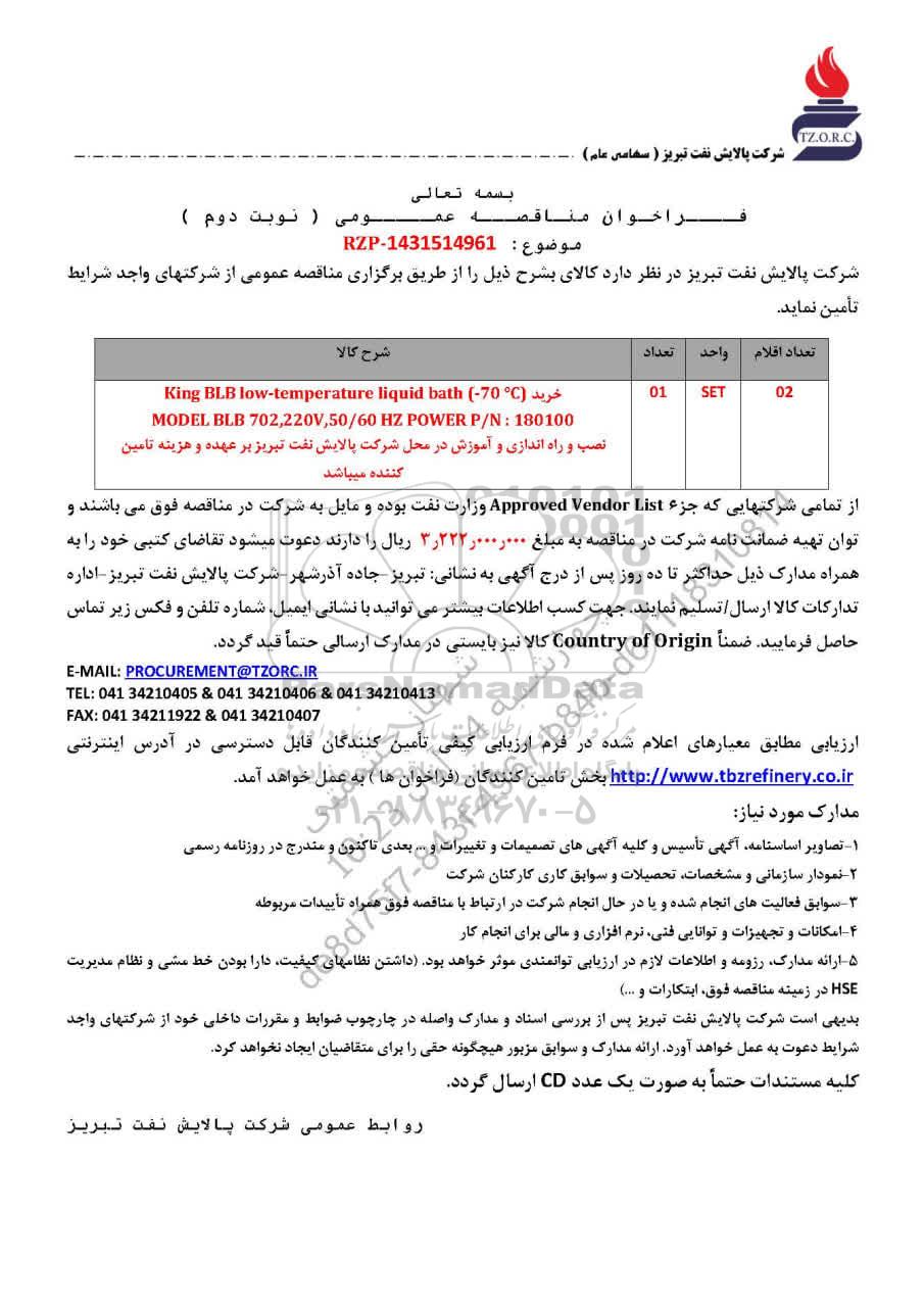 شرکت پالایش نفت تبریز در نظر دارد کالای بشرح ذیل را از طریق برگزاری مناقصه عمومی از شرکتهای واجد شرایط تامین نماید.