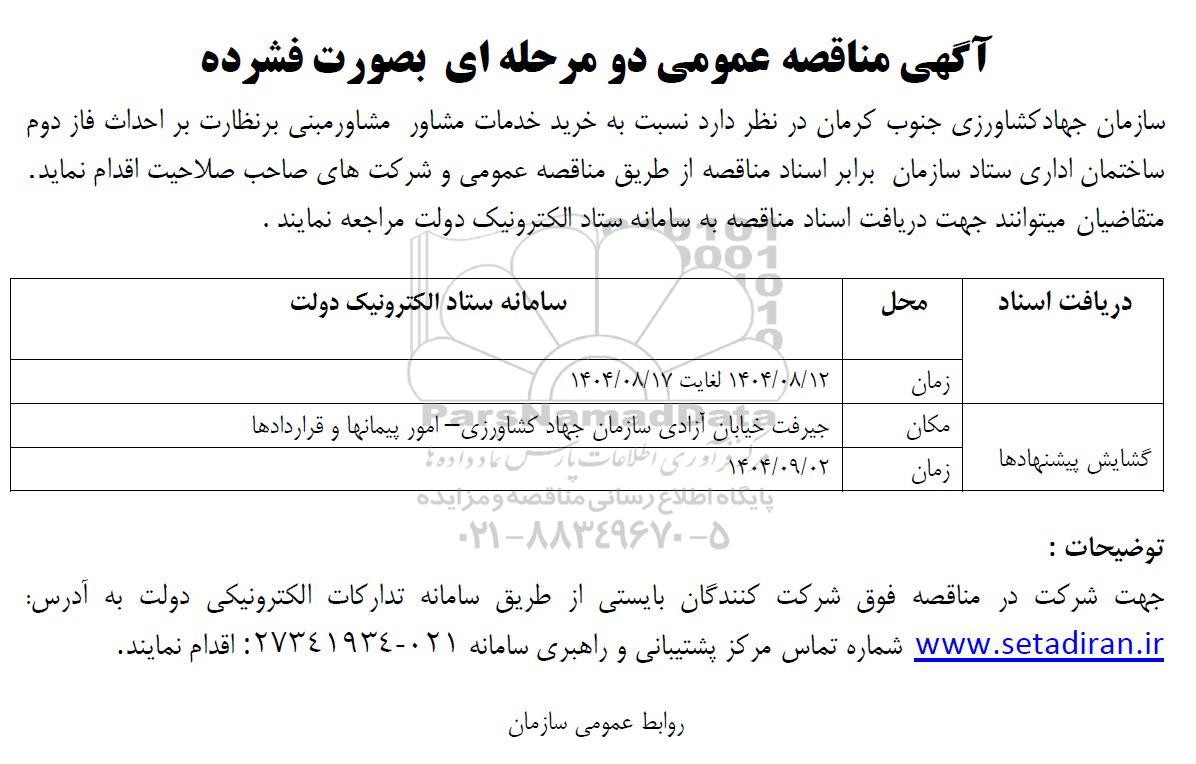 سازمان جهاد کشاورزی جنوب کرمان در نظر دارد نسبت به خرید خدمات مشاور مشاور مبنی بر نظارت بر احداث فاز دوم ساختمان اداری ستاد سازمان برابر اسناد مناقصه از طریق مناقصه عمومی و شرکتهای صاحب صلاحیت اقدام نماید. متقاضیان میتوانند جهت دریافت اسناد مناقصه به سامانه ستاد الکترونیک دولت مراجعه نمایند .