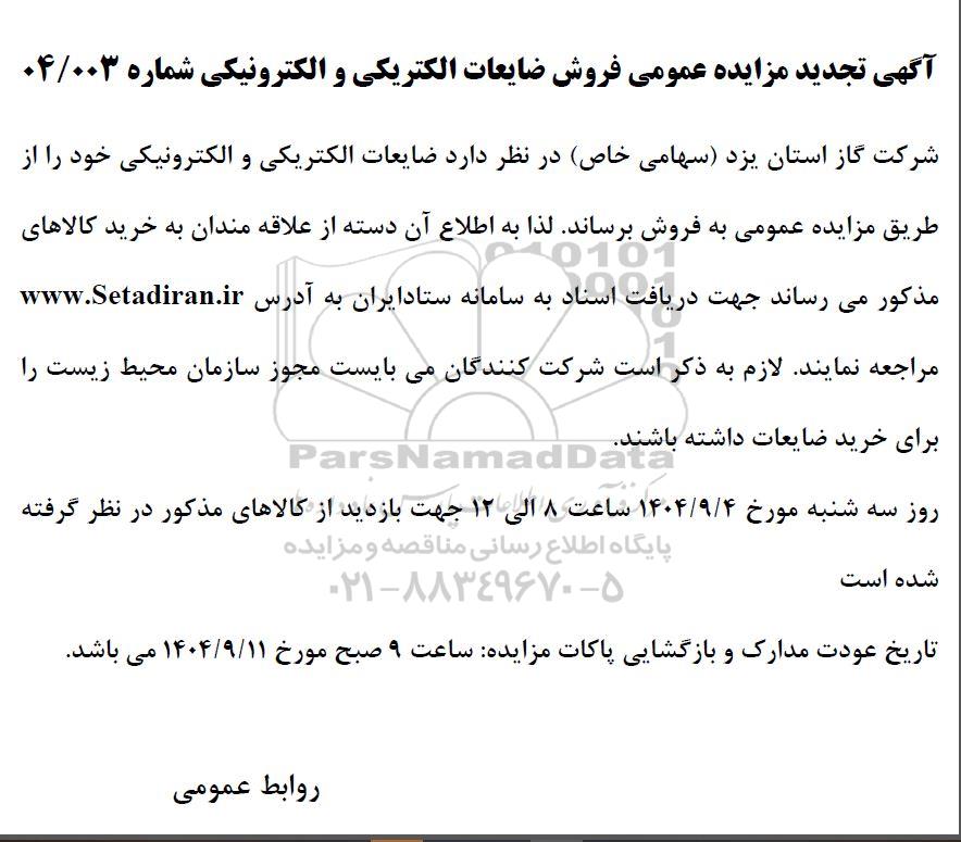 شرکت گاز استان یزد سهامی خاص در نظر دارد ضایعات الکتریکی و الکترونیکی خود را از طریق مزایده عمومی به فروش برساند. لذا به اطلاع آن دسته از علاقه مندان به خرید کالاهای مذکور می رساند جهت دریافت اسناد به سامانه ستاد ایران به آدرس ستاد ایران مراجعه نمایند. لازم به ذکر است شرکت کنندگان میبایست مجوز سازمان محیط زیست را برای خرید ضایعات داشته باشند.