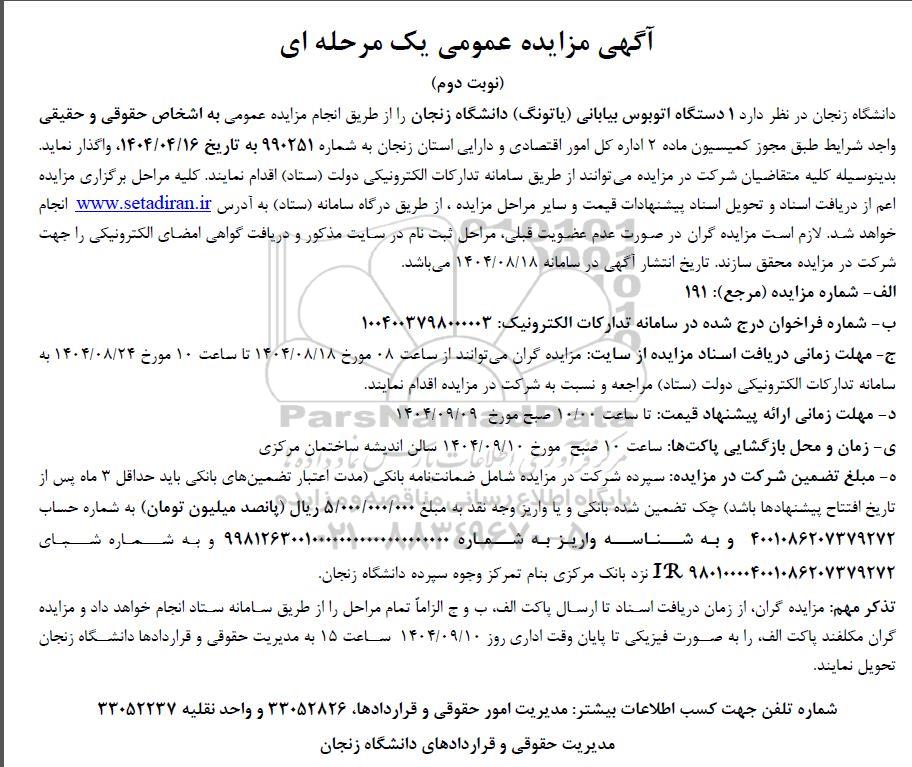 دانشگاه زنجان در نظر دارد 1 دستگاه اتوبوس بیابانی پاتونگ دانشگاه زنجان را از طریق از جام مزایده عمومی به اشخاص حقوقی و حقیقی واجد شرایط طبق مجوز کمیسیون ماده 2 اداره کل امور اقتصادی و دارایی استان زنجان به شماره 990251 به تاریخ 1404.04.16 واگذار نماید. بدینوسیله کلیه متقاضیان شرکت در مزایده میتوانند از طریق سامانه تدارکات الکترونیکی دولت (ستاد) اقدام نمایند. کلیه مرا حل برگزاری مزایده اعم از دریافت اسناد و تحویل اسناد پیشنهادات قیمت و سایر مراحل مزایده، از طریق درگاه سامانه ( ستاد) به آدرس ستاد ایران انجام خواهد شد. لازم است مزایده گران در صورت عدم عضویت قبلی مراحل ثبت نام در سایت مذکور و دریافت گواهی امضای الکترونیکی را جهت شرکت در مزایده محقق سازند تاریخ انتشار آگهی در سامانه 1404.08.18 می باشد.