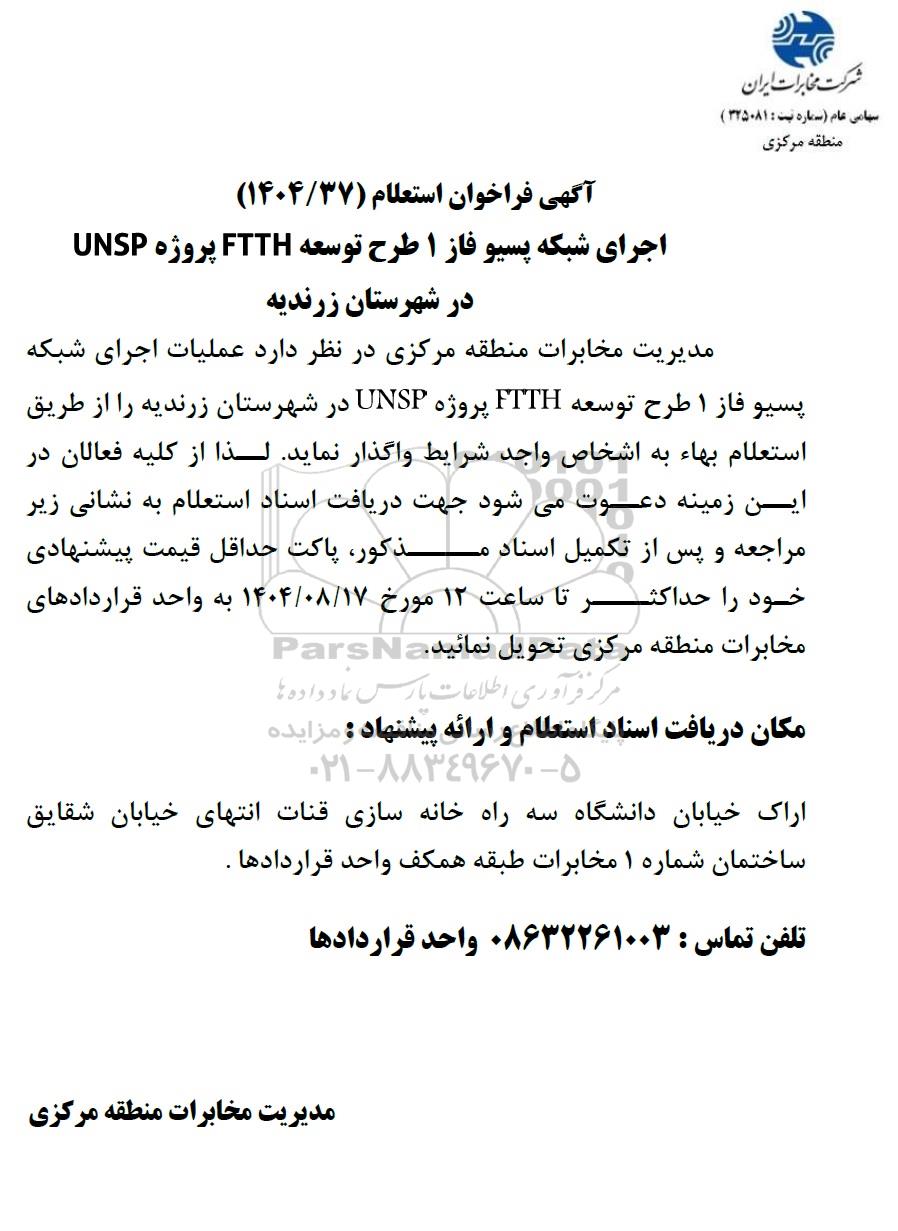مدیریت مخابرات منطقه مرکزی در نظر دارد عملیات اجرای شبکه پسیو فاز 1 طرح توسعه FTTH پروژه UNSP در شهرستان زرندیه را از طریق استعلام بهاء به اشخاص واجد شرایط واگذار نماید. لذا از کلیه فعالان در این زمینه دعوت می شود جهت دریافت اسناد استعلام به نشانی زیر مراجعه و پس از تکمیل اسناد مذکور، پاکت حداقل قیمت پیشنهادی خود را حداکثر تا ساعت 12 مورخ 1404.08.17 به واحد قراردادهای مخابرات منطقه مرکزی تحویل نمائید.