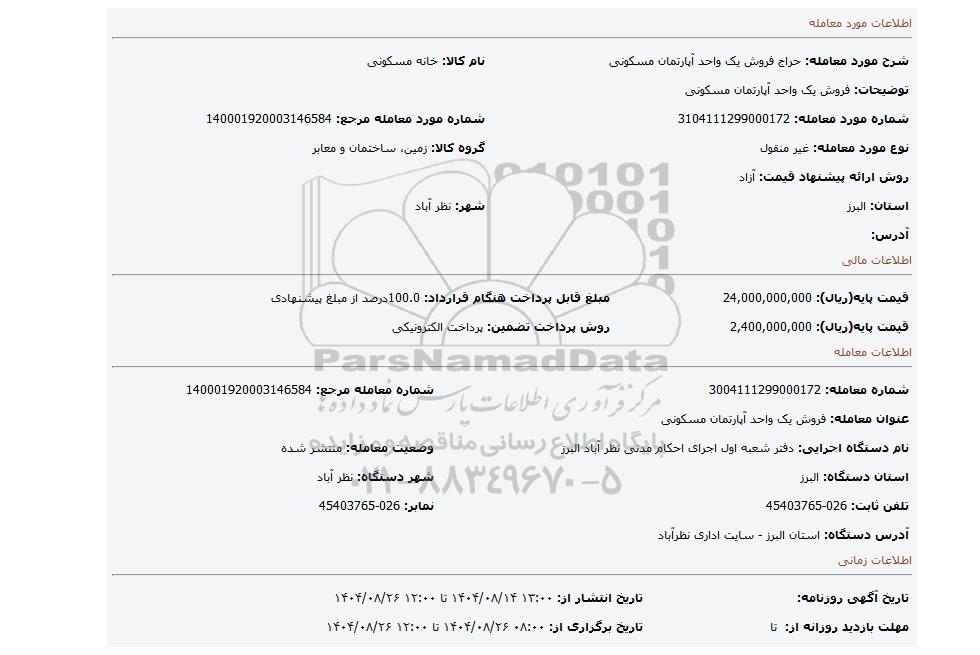 | عنوان معامله: فروش یک واحد آپارتمان مسکونی | ||
