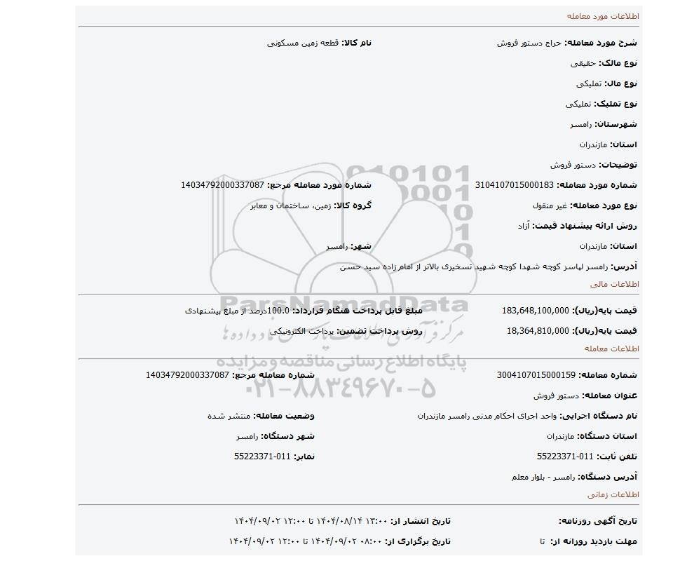 | شرح مورد معامله: حراج دستور فروش | نام کالا: قطعه زمین مسکونی | |