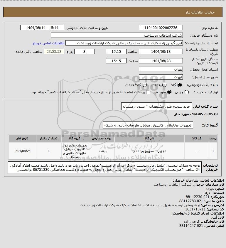 | 1 | -- | تجهیزات سوییچ برد مدار | عدد | تجهیزات مخابراتی، کامپیوتر، موبایل، ملزومات جانبی و شبکه | 1 | 1404/08/24 |