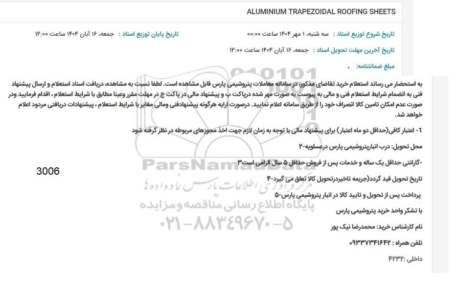 استعلام مناقصه ALUMINIUM TRAPEZOIDAL ROOFING SHEETS
