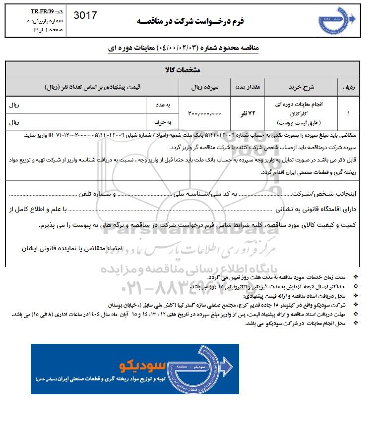 | 1 | انجام معاینات دوره ای کارکنان (طبق لیست پیوست) | 72 نفر | 200.000.000 |