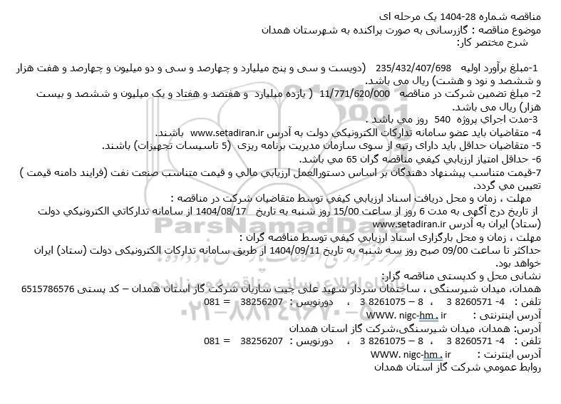 موضوع مناقصه : گازرسانی به صورت پراکنده به شهرستان همدان