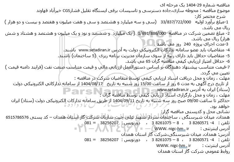 موضوع مناقصه : محوطه سازی جاده دسترسی و تاسیسات برقی ایستگاه تقلیل فشار CGS خیرآباد قهاوند