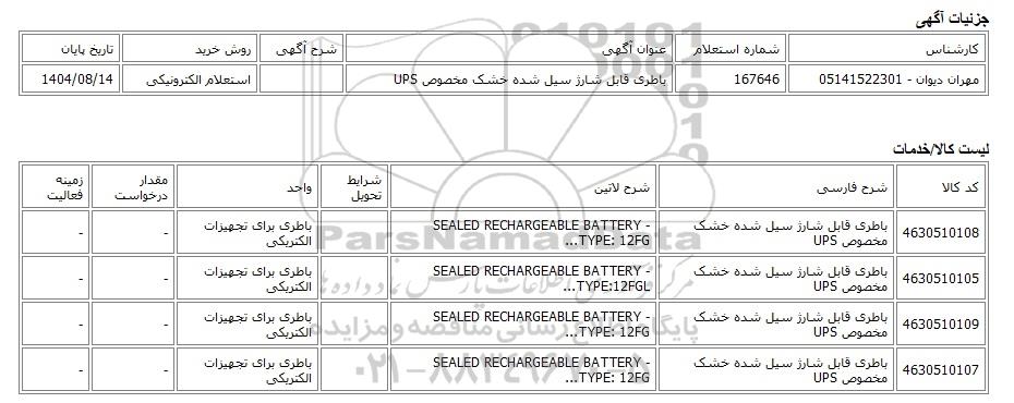 | مهران دیوان - 05141522301 | 167646 | باطری قابل شارژ سیل شده خشک مخصوص UPS | استعلام الکترونیکی | 1404/08/14 |