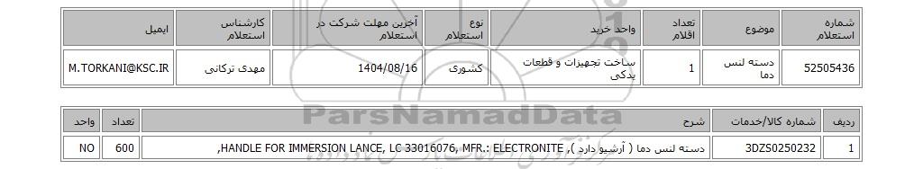 | 1 | 3DZS0250232 | دسته لنس دما ( آرشیو دارد ), HANDLE FOR IMMERSION LANCE, LC 33016076, MFR.: ELECTRONITE, | 600 | NO |