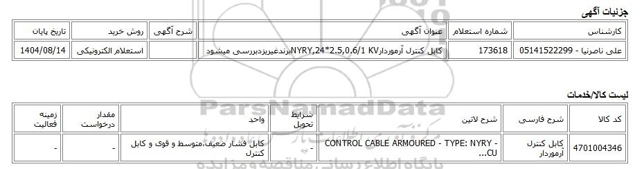 | علی ناصرنیا - 05141522299 | 173618 | کابل کنترل آرموردارNYRY,24*2.5,0.6/1 KVبرندغیریزدبررسی میشود | استعلام الکترونیکی | 1404/08/14 |