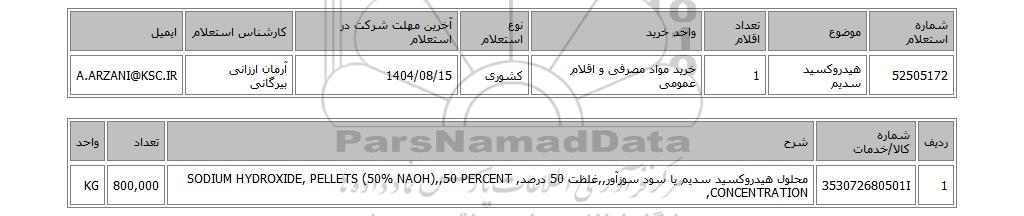 | 52505172 | هیدروکسید سدیم | 1 | خرید مواد مصرفی و اقلام عمومی | کشوری | 1404/08/15 | آرمان ارزانی بیرگانی | A.ARZANI@KSC.IR |