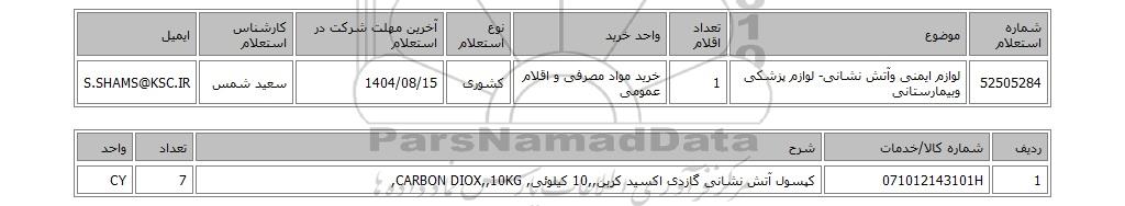 | 52505284 | لوازم ایمنی وآتش نشانی- لوازم پزشکی وبیمارستانی | 1 | خرید مواد مصرفی و اقلام عمومی | کشوری | 1404/08/15 | سعید شمس | S.SHAMS@KSC.IR |