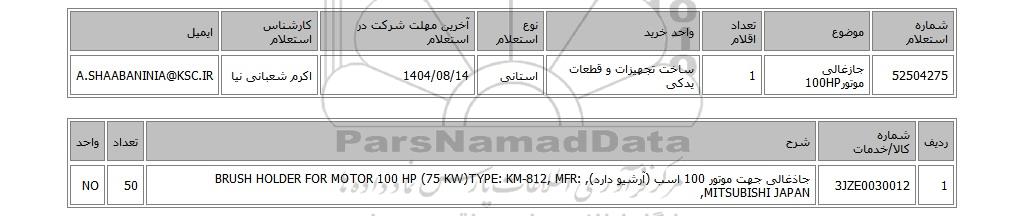 | 52504275 | جازغالی موتور100HP | 1 | ساخت تجهیزات و قطعات یدکی | استانی | 1404/08/14 | اکرم شعبانی نیا | A.SHAABANINIA@KSC.IR |