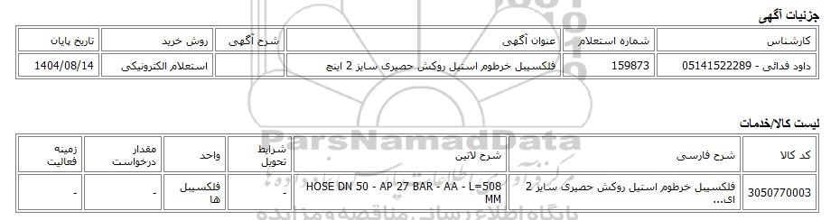 | داود فدائی - 05141522289 | 159873 | فلکسیبل خرطوم استیل روکش حصیری سایز 2 اینچ | استعلام الکترونیکی | 1404/08/14 |