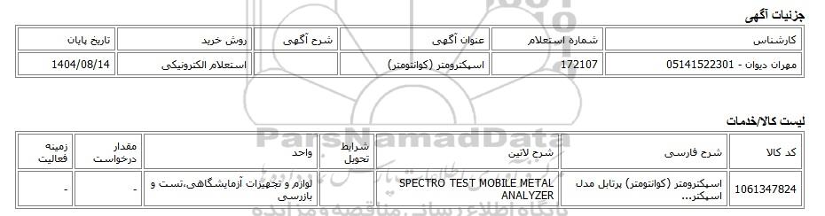 | مهران دیوان - 05141522301 | 172107 | اسپکترومتر (کوانتومتر) | استعلام الکترونیکی | 1404/08/14 |