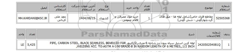 | 52505368 | مقاطع فلزی خاص(شامل لوله ها - میل های گرد،چهارگوش - شش گوش) | 1 | خرید مواد مصرفی و اقلام عمومی | کشوری | 1404/08/15 | محمد علی کردانی | MH.KARDANI@KSC.IR |