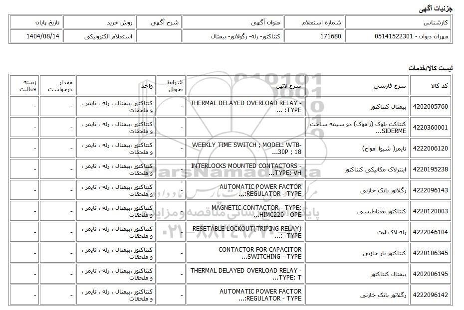 | مهران دیوان - 05141522301 | 171680 | کنتاکتور- رله- رگولاتور- بیمتال | استعلام الکترونیکی | 1404/08/14 |