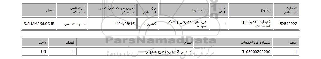 | 52502922 | نگهداری تعمیرات و تاسیسات | 1 | خرید مواد مصرفی و اقلام عمومی | کشوری | 1404/08/15 | سعید شمس | S.SHAMS@KSC.IR |