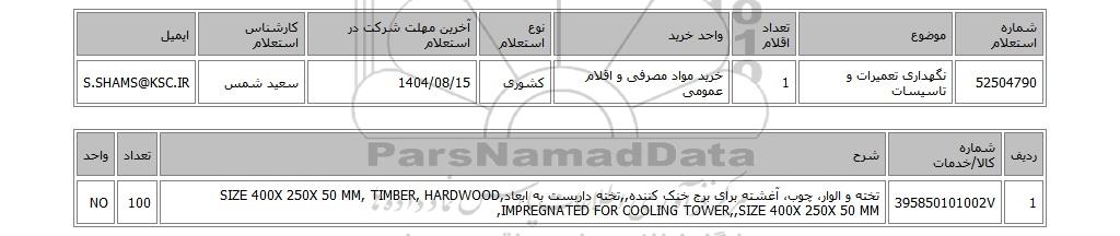 | 52504790 | نگهداری تعمیرات و تاسیسات | 1 | خرید مواد مصرفی و اقلام عمومی | کشوری | 1404/08/15 | سعید شمس | S.SHAMS@KSC.IR |
