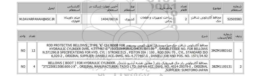 شماره استعلامموضوعتعداد اقلامواحد خریدنوع استعلامآخرین مهلت شرکت در استعلامکارشناس استعلامایمیل