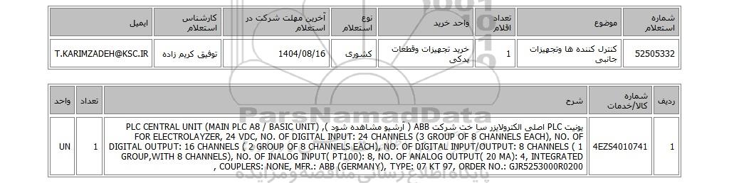 | 52505332 | کنترل کننده ها وتجهیزات جانبی | 1 | خرید تجهیزات وقطعات یدکی | کشوری | 1404/08/16 | توفیق کریم زاده | T.KARIMZADEH@KSC.IR |