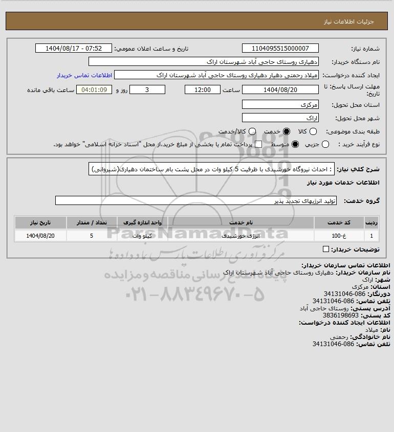 شرح کلی نیاز: : احداث نیروگاه خورشیدی با ظرفیت 5 کیلو وات در محل پشت بام ساختمان دهیاری(شیروانی)