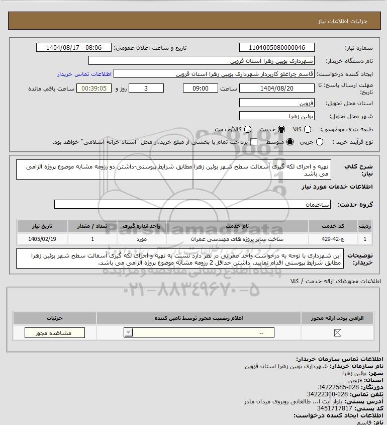 شرح کلی نیاز: تهیه و اجرای لکه گیری آسفالت سطح شهر بوئین زهرا مطابق شرایط پیوستی-داشتن دو رزومه مشابه موضوع پروژه الزامی می باشد