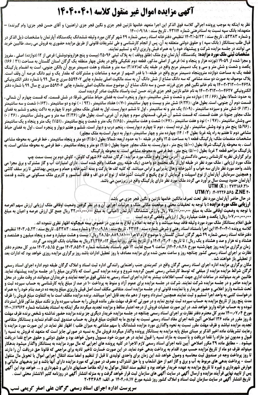 آگهی مزایده اموال غیر منقول کلاسه 140400401