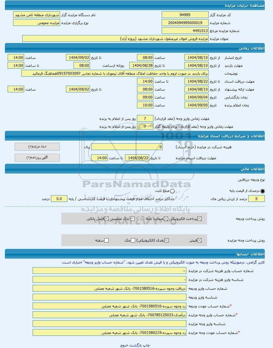 شماره مال2104094995000098نوع برگزاری مزایده مزایده عمومی