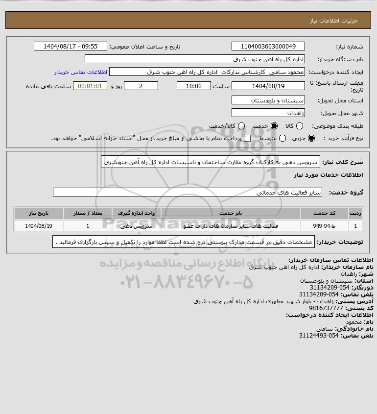 استعلام سرویس دهی به کارکنان گروه نظارت ساختمان و تاسیسات اداره کل راه آهن جنوبشرق, استعلام سرویس دهی به کارکنان گروه نظارت ساختمان و تاسیسات اداره کل راه آهن جنوبشرق