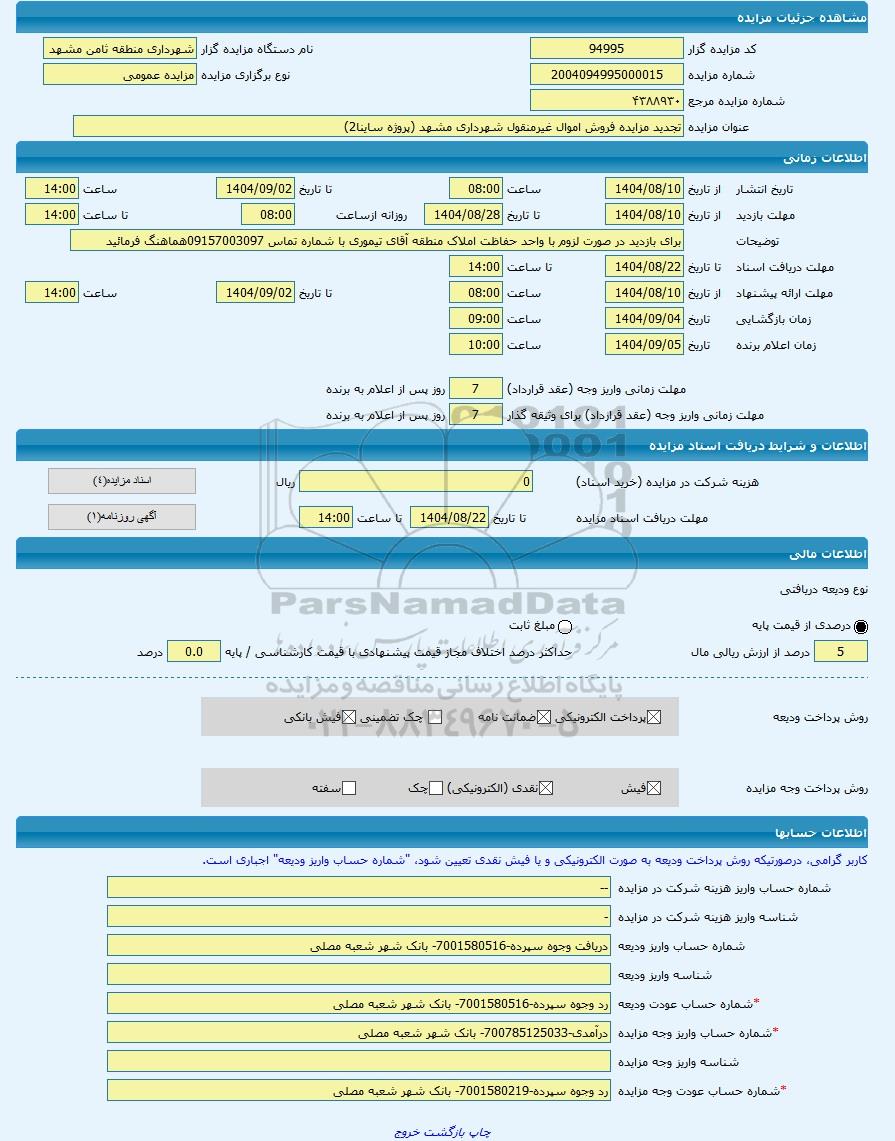 | عنوان مزایده | تجدید مزایده فروش اموال غیرمنقول شهرداری مشهد (پروژه ساینا2) -مزایده واحد تجاری - استان خراسان رضوی | |||